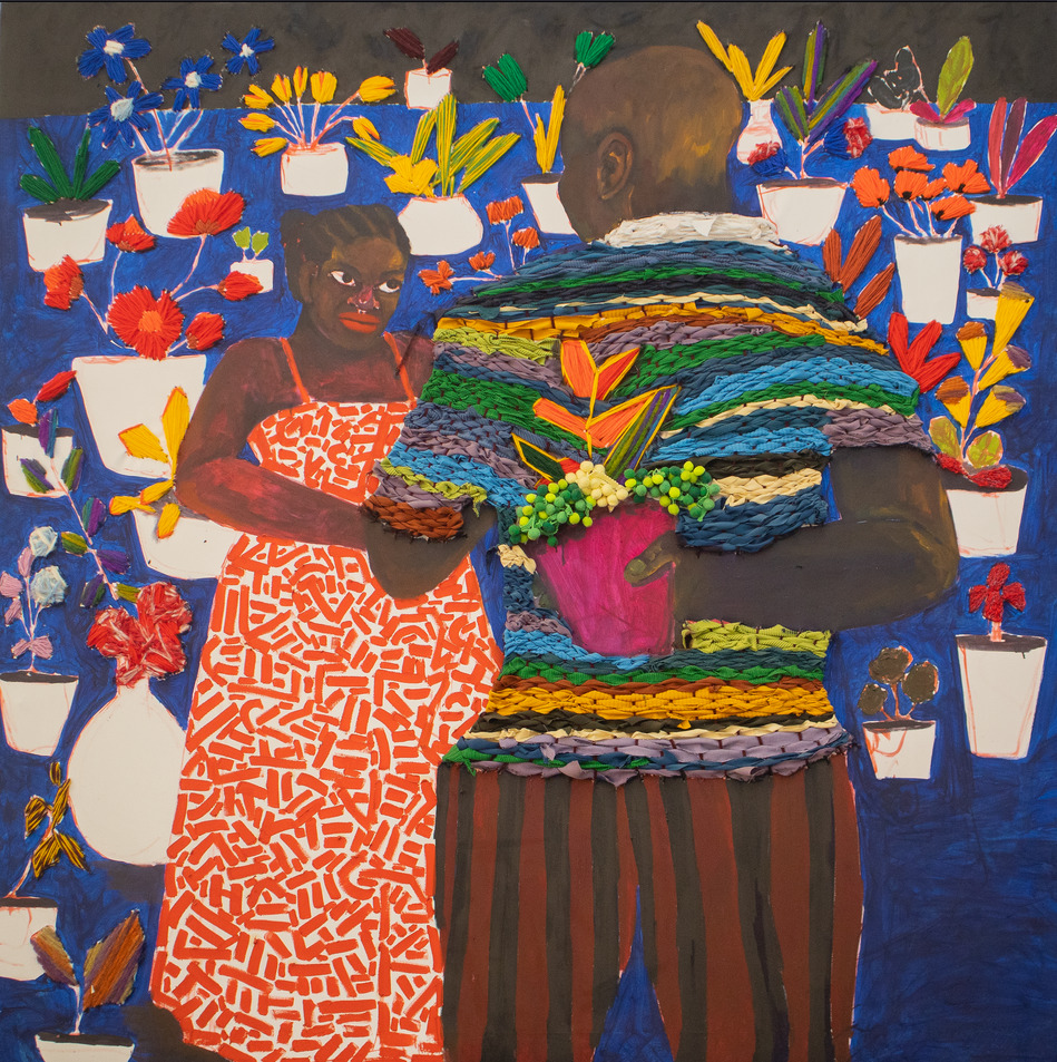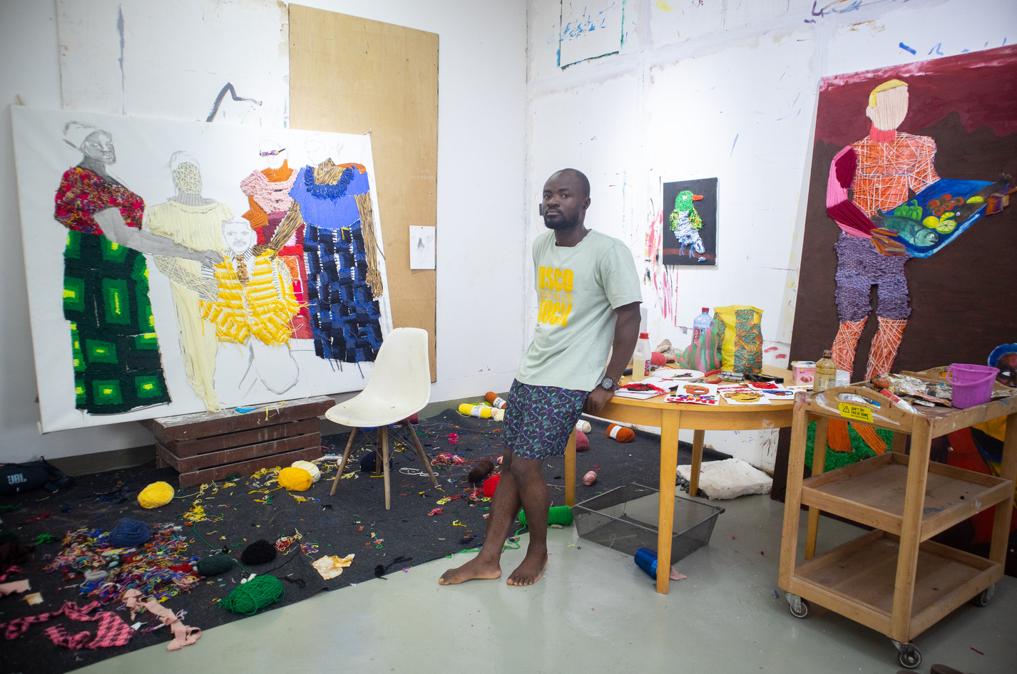 Coffie’s practice combines yarn, oil paint, and visual memory to create textured figurative works that